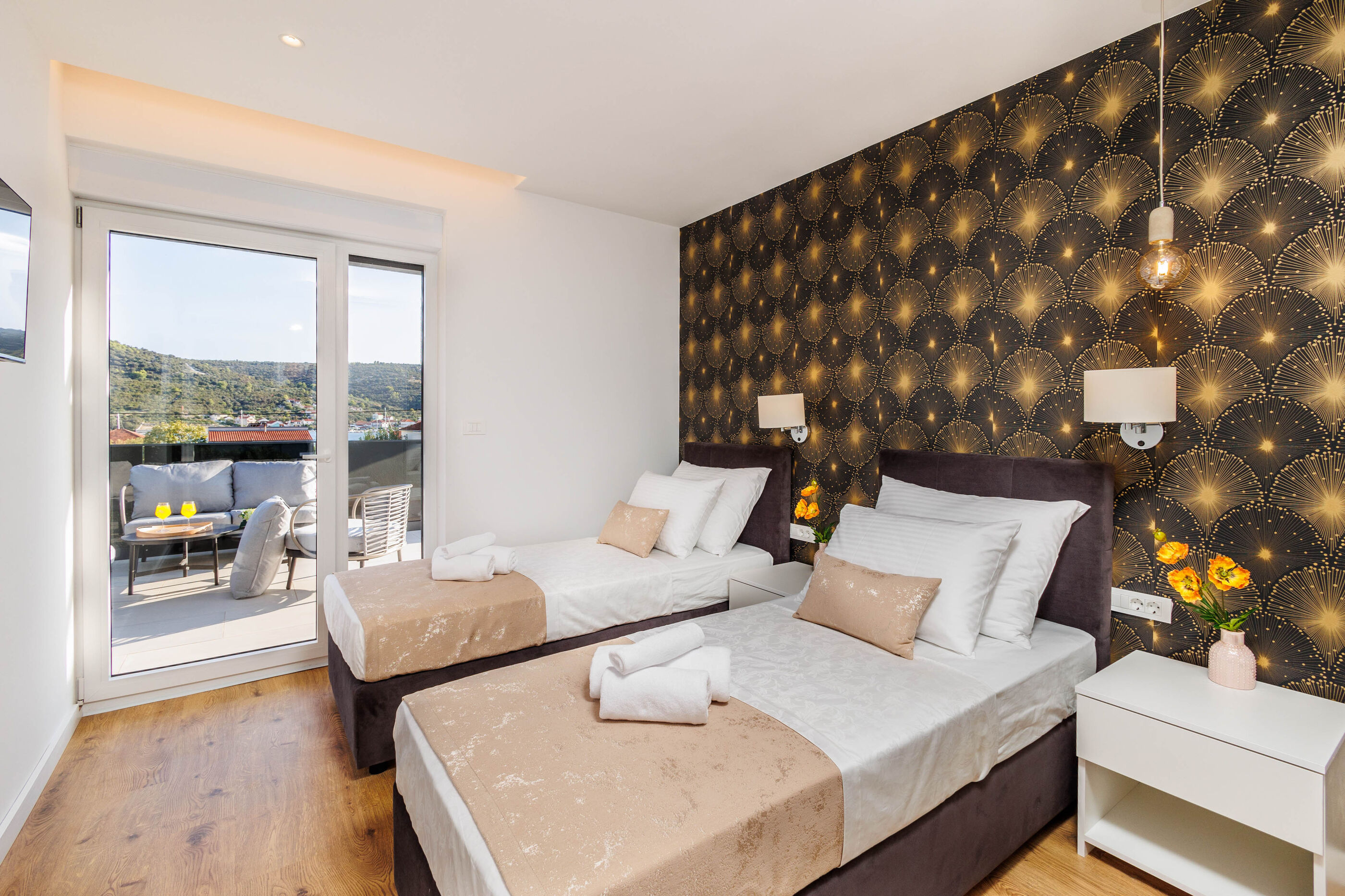 - Zahl der zusätzliche Betten (im Wohnzimmer, Esszimmer und in der Küche): 2