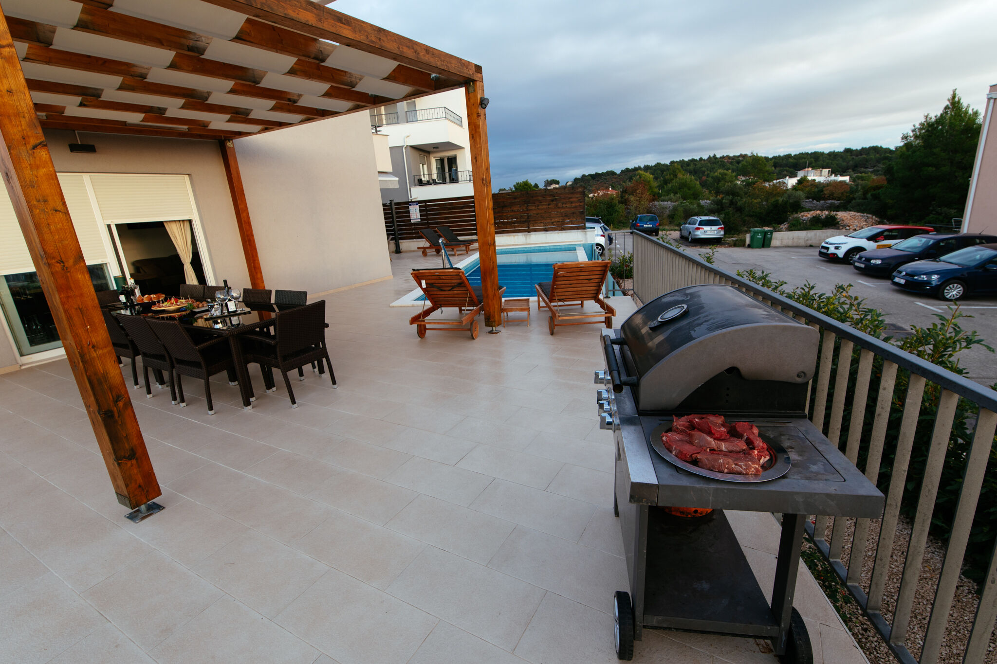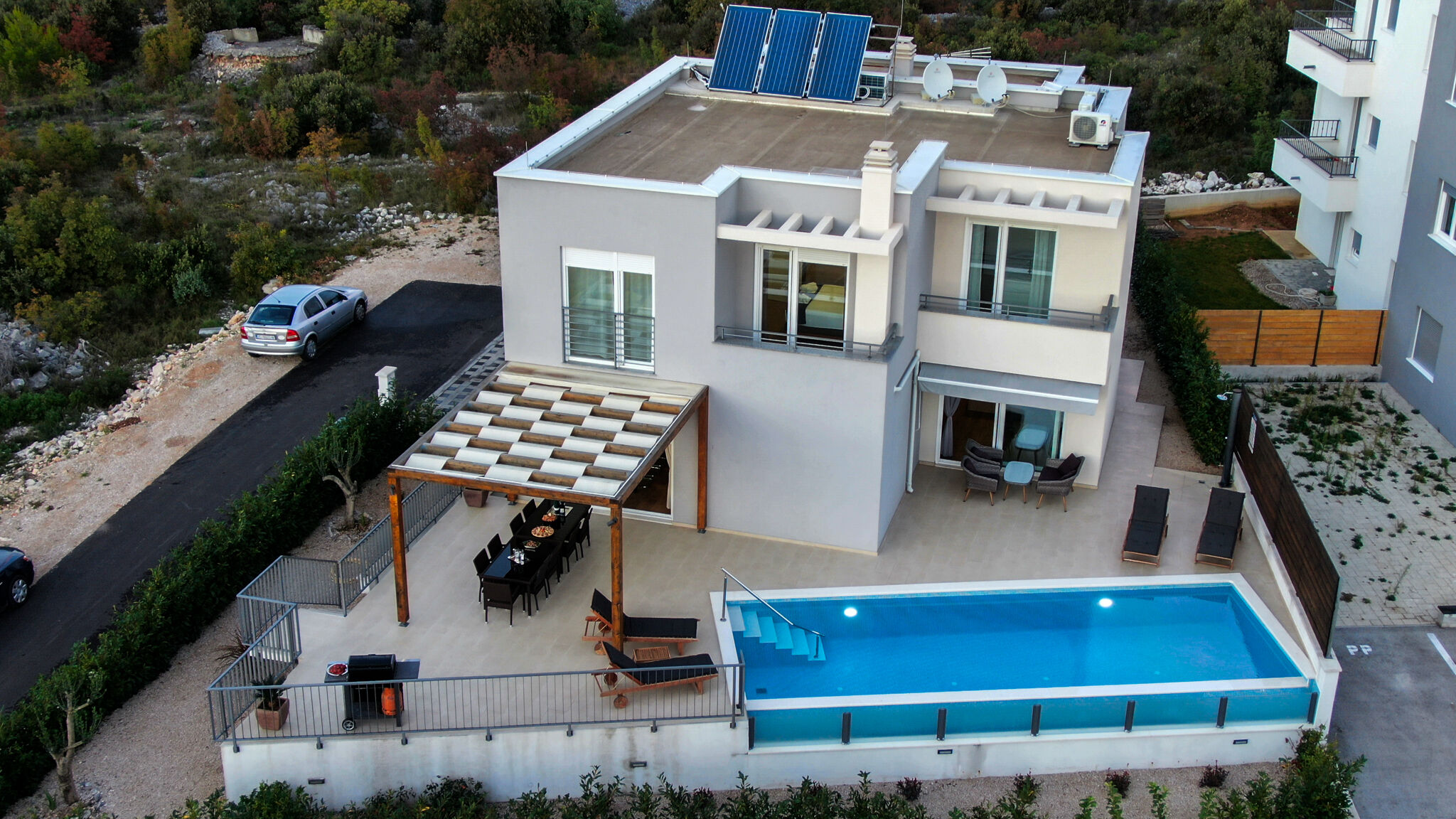 Genießen Sie kristallklares Meer und fangen Sie lange Sonnenuntergänge am Felsstrand, Kiesstrand mit betonierten Liegeflächen Strand 600 m entfernt. Für diejenigen die Privatsphäre bevorzugen, tauchen Sie in den Swimmingpool im Freien ein & tanken Sie den ganzen Tag Sonne.