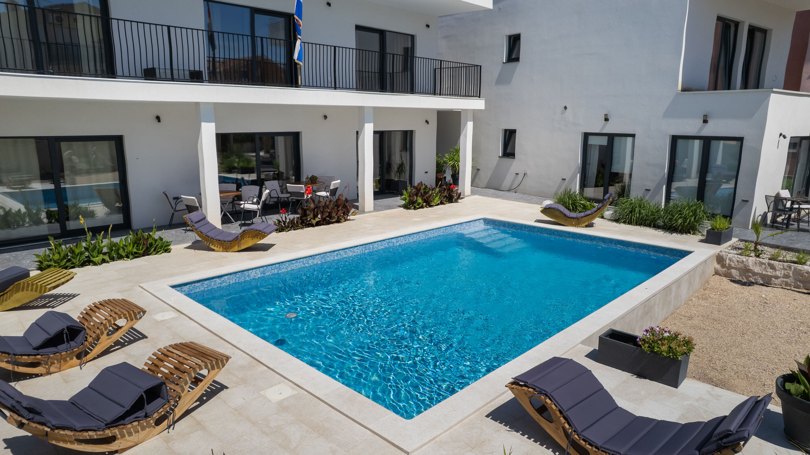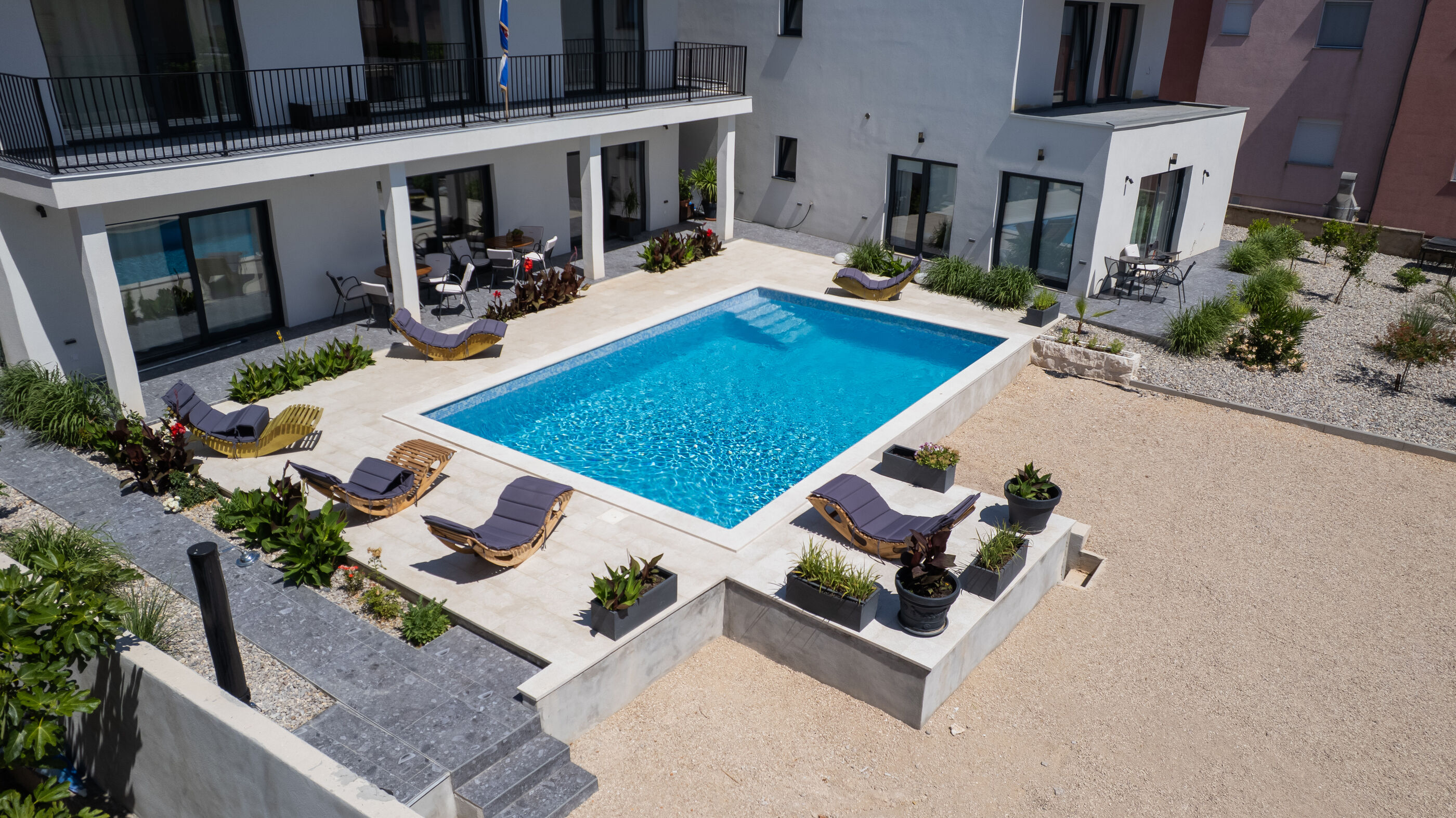 - Art des Badestrandes: Kiesstrand mit betonierten Liegeflächen