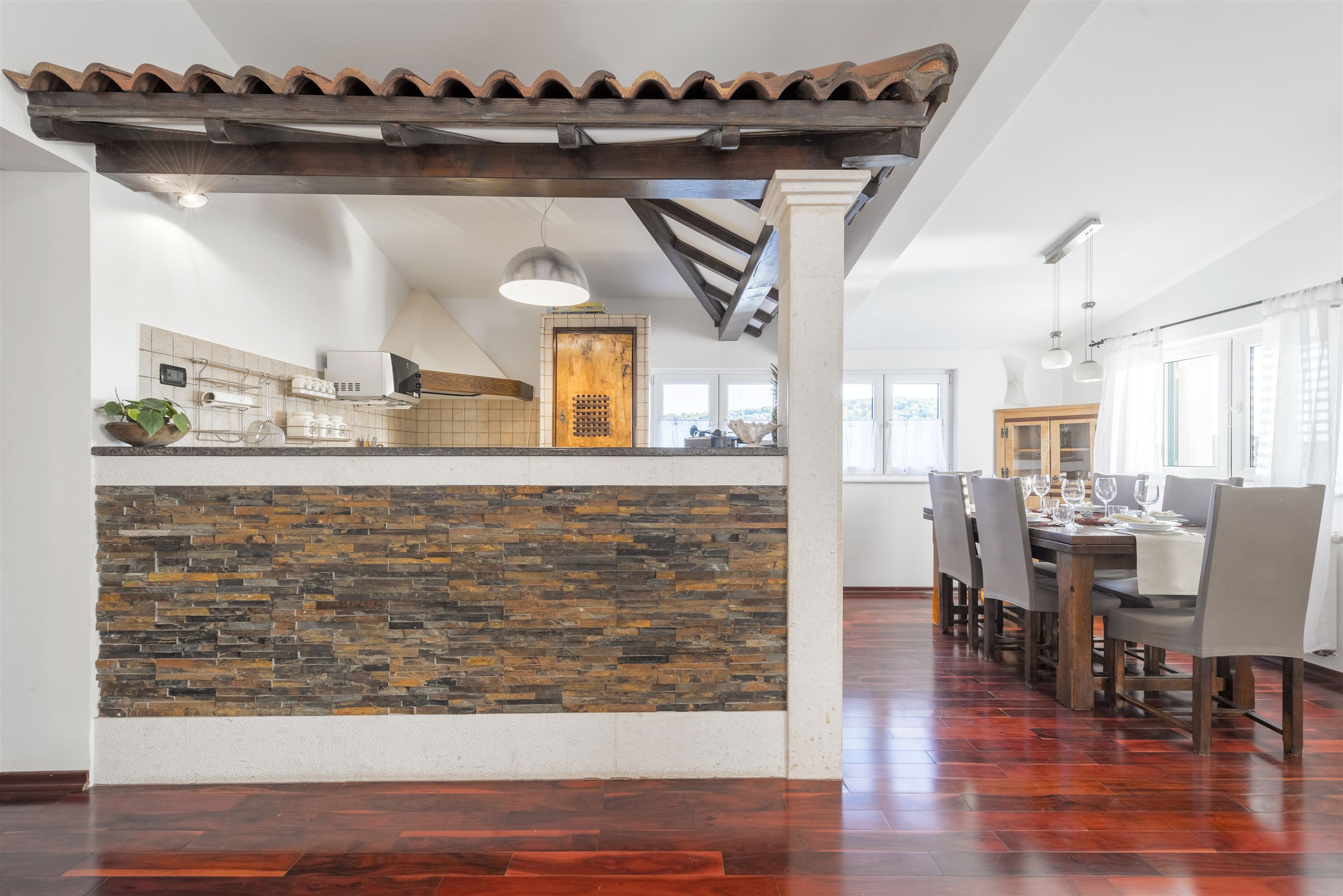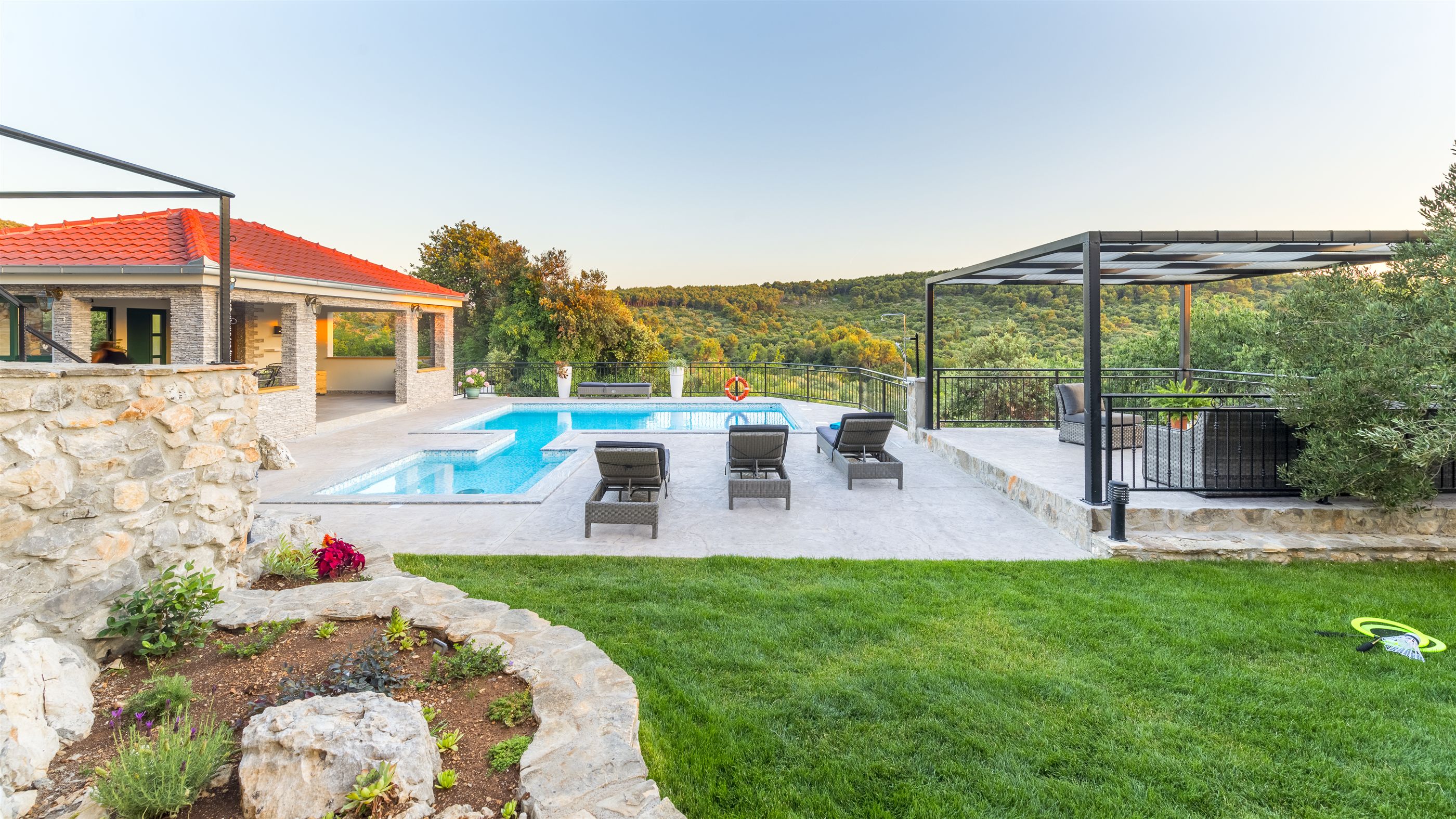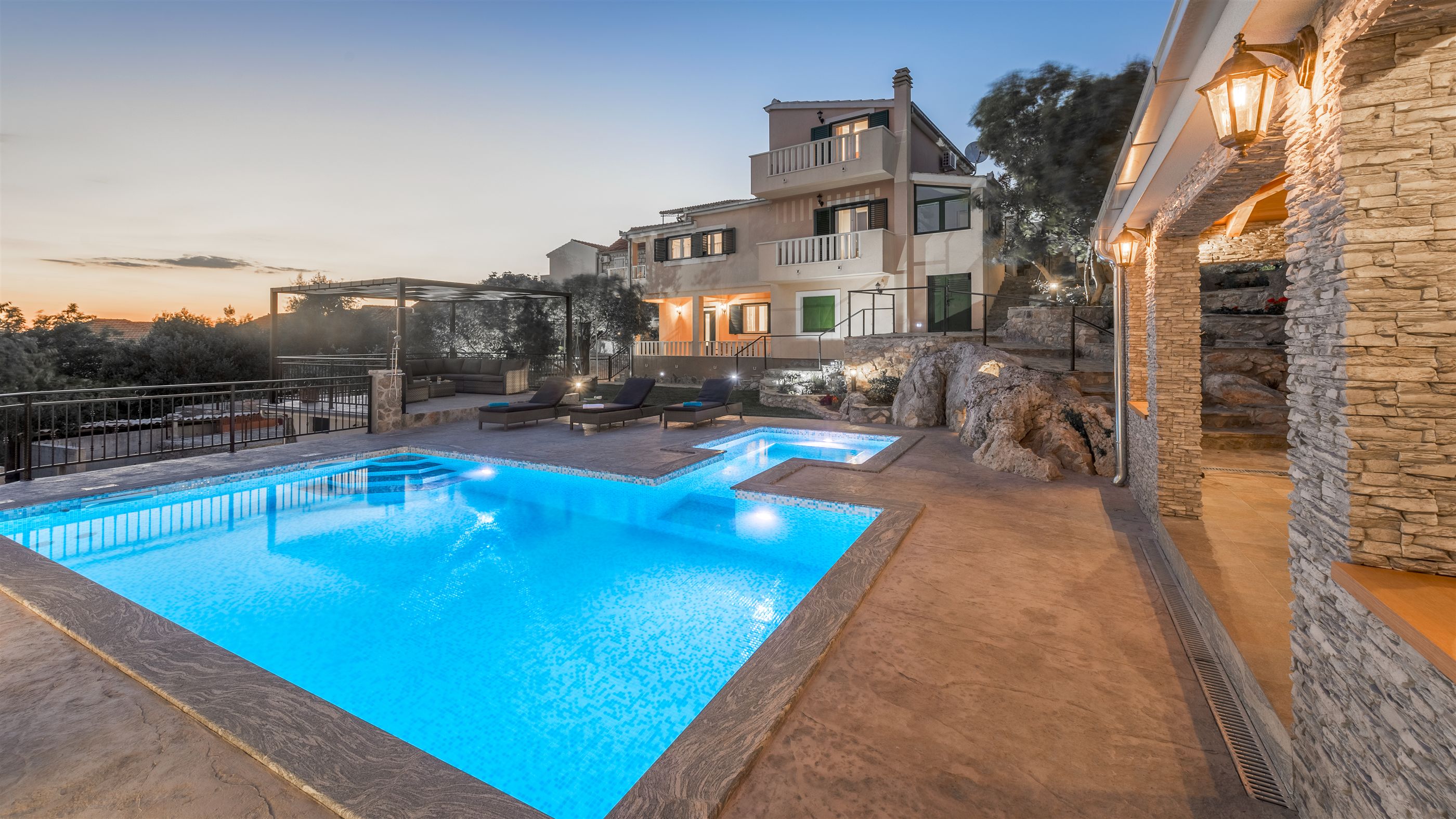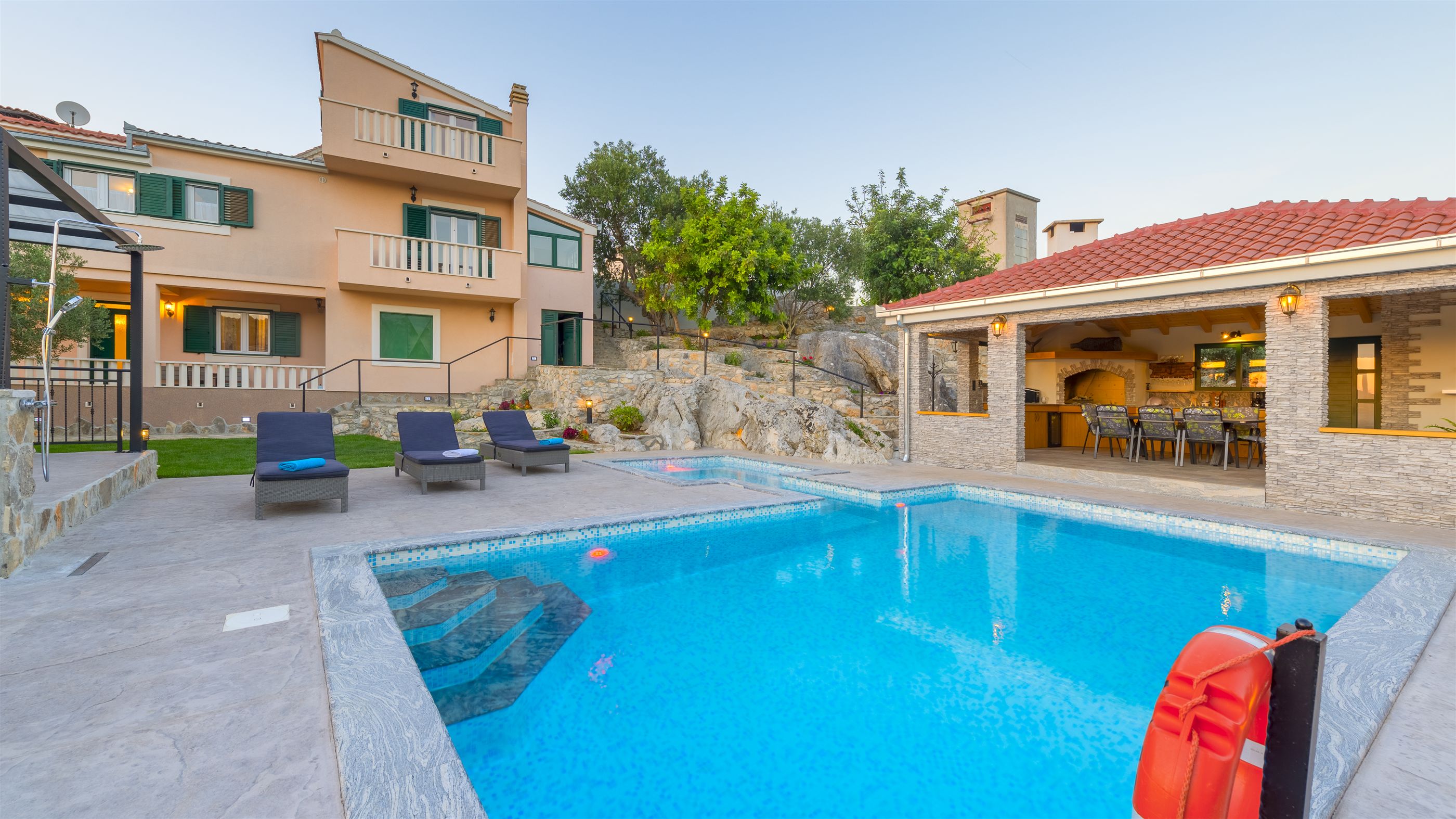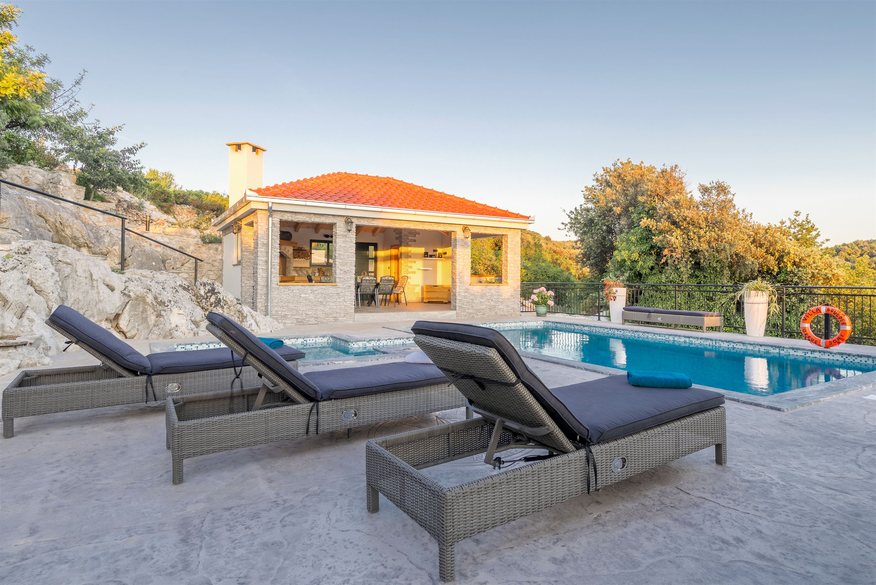 Villa Boulder is located in Okrug Donji on the island of Čiovo, not far from the historic town of Trogir. The quiet environment and beautiful nature of Okrug Donji attract many families, but also those who love sports. Numerous forest paths are suitable for active outdoor vacations and pleasant walks through the beautiful landscape. Villa Boulder consists of fully equipped kitchens, dining and living areas in one room, four modern bedrooms, three bathrooms and one toilet.