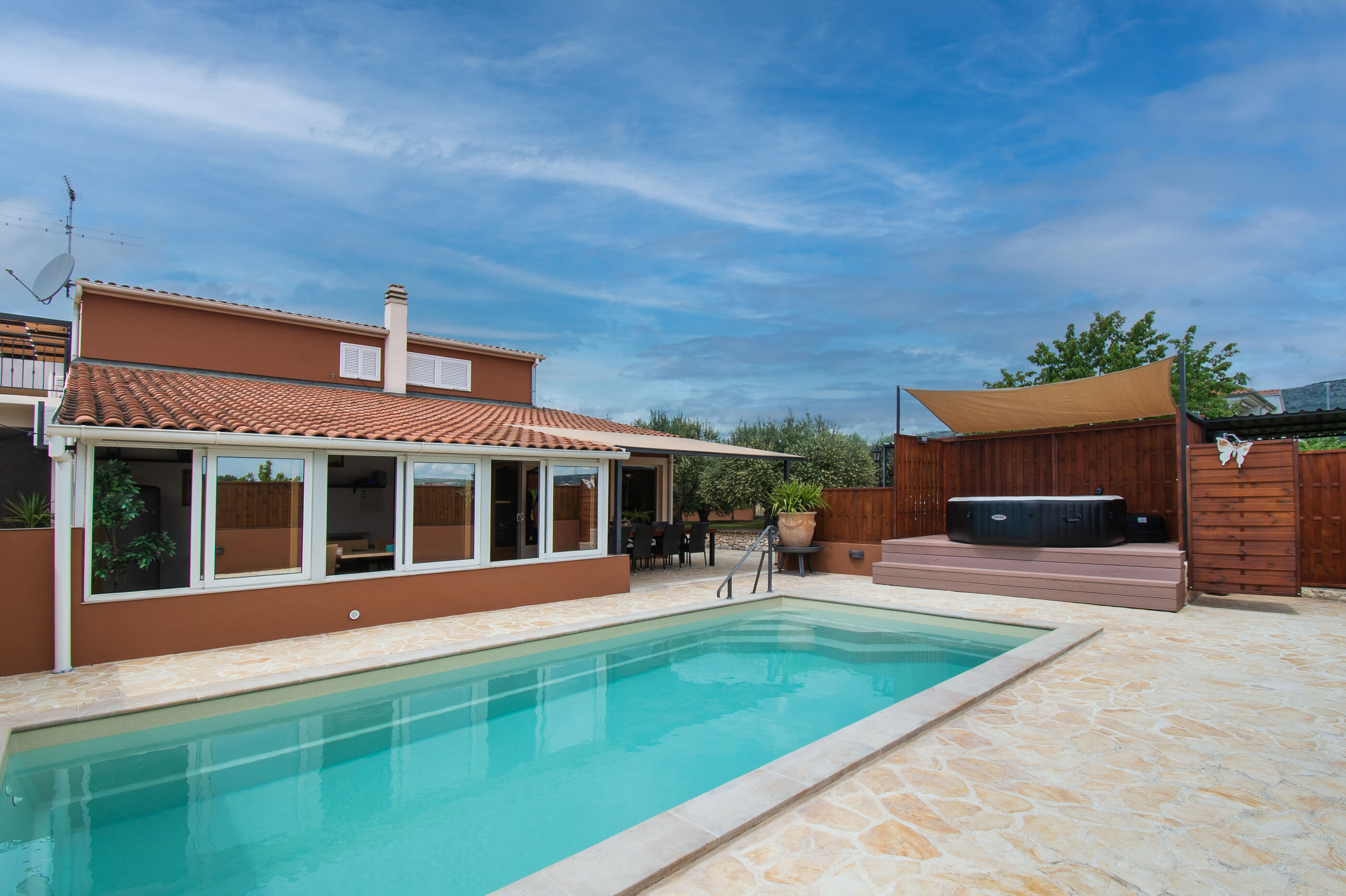 Welcome in the idyllic setting of Dubrava, Šibenik, where Villa Jakov offers an ideal vacation in house designed with blend of rustic charm and modern amenities. This magnificent villa is designed to provide a truly memorable experience for large groups and families, accommodating up to 12 guests in its five comfortable bedrooms. Two of the bedrooms include an extra bed for additional guests, ensuring ample space for everyone. With two bathrooms and three toilets, convenience and privacy are guaranteed for all.