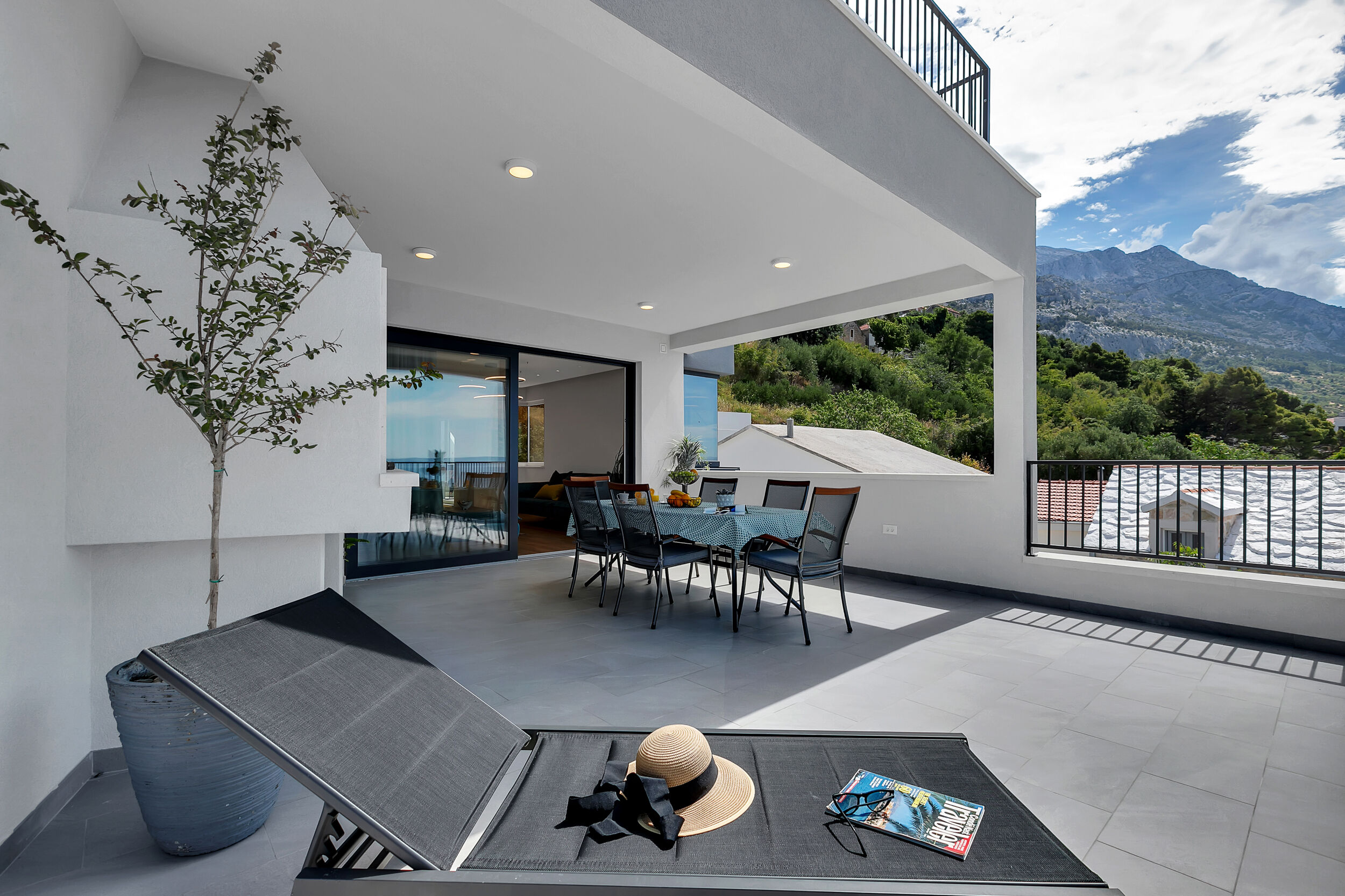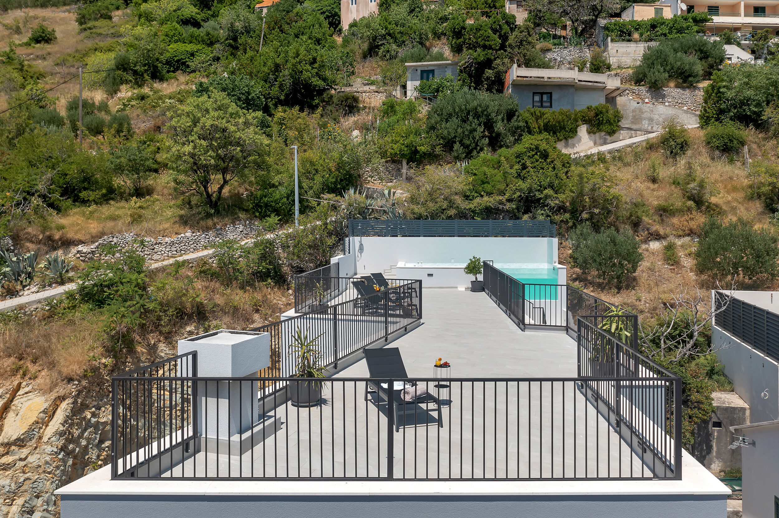 Nestled within the breathtaking beauty of the Makarska Riviera, the quaint town of Brela stands as one of its most captivating jewels. Here, amidst the splendor of this coastal paradise, lies the exquisite Roof Pool Villa. True to its name, this stunning retreat boasts a rooftop oasis, offering unparalleled vistas of the azure Adriatic Sea and the majestic island of Brač on one side, while the imposing Biokovo mountain range looms proudly on the other, with its rugged cliffs and steep slopes. Spanning an area of 185 square meters, this villa is a harmonious blend of luxury and comfort.