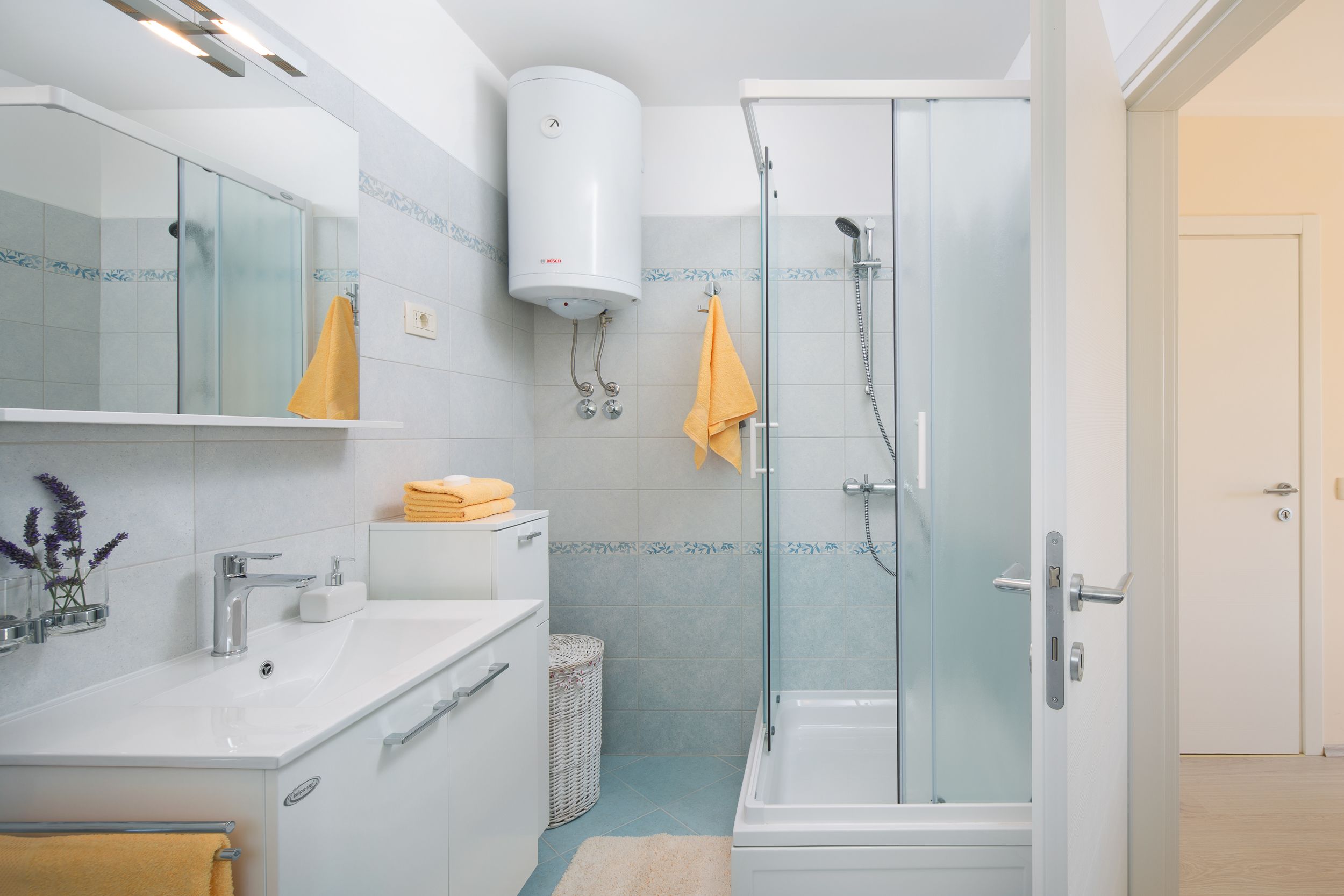 - Hot water for shower: in the bathroom