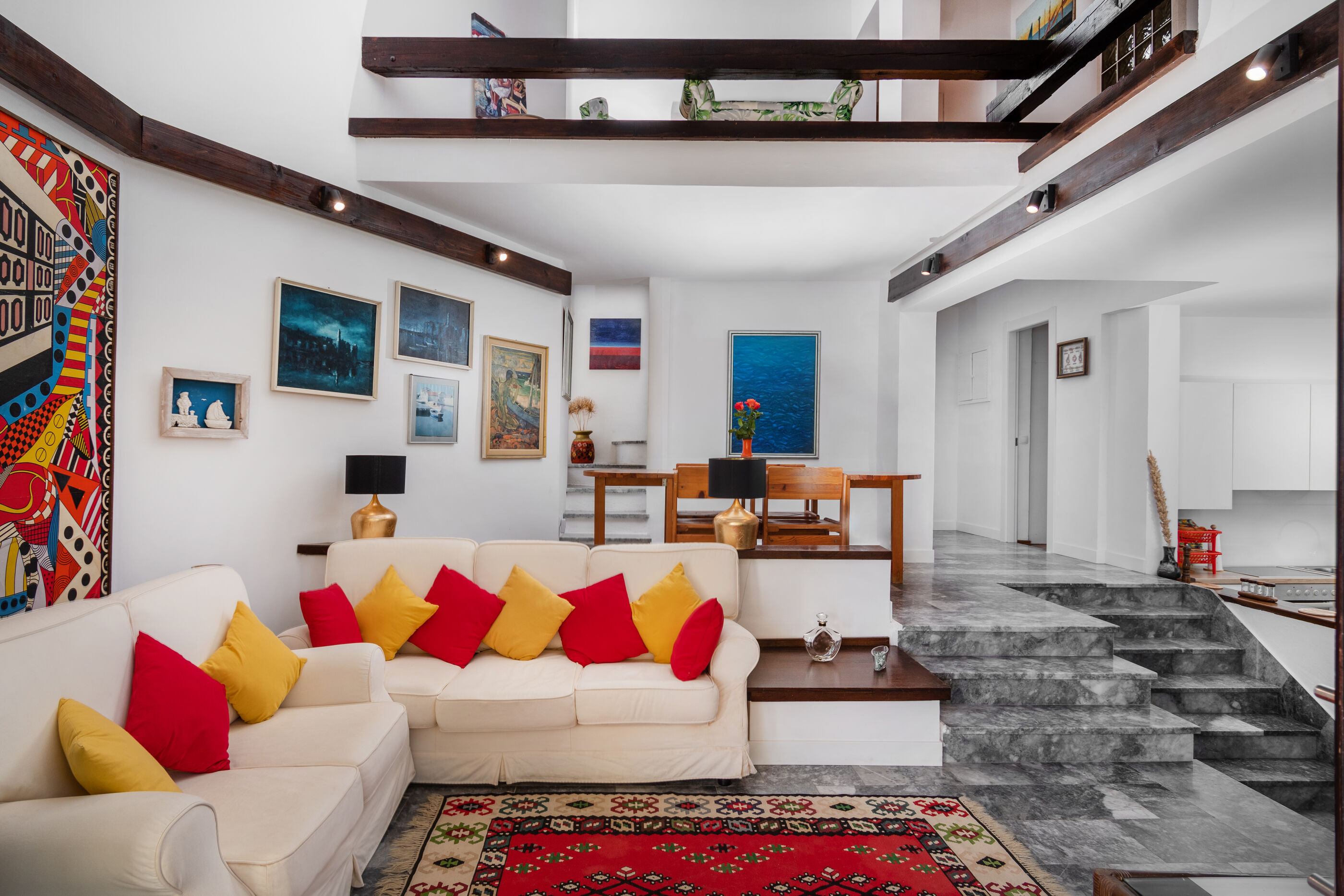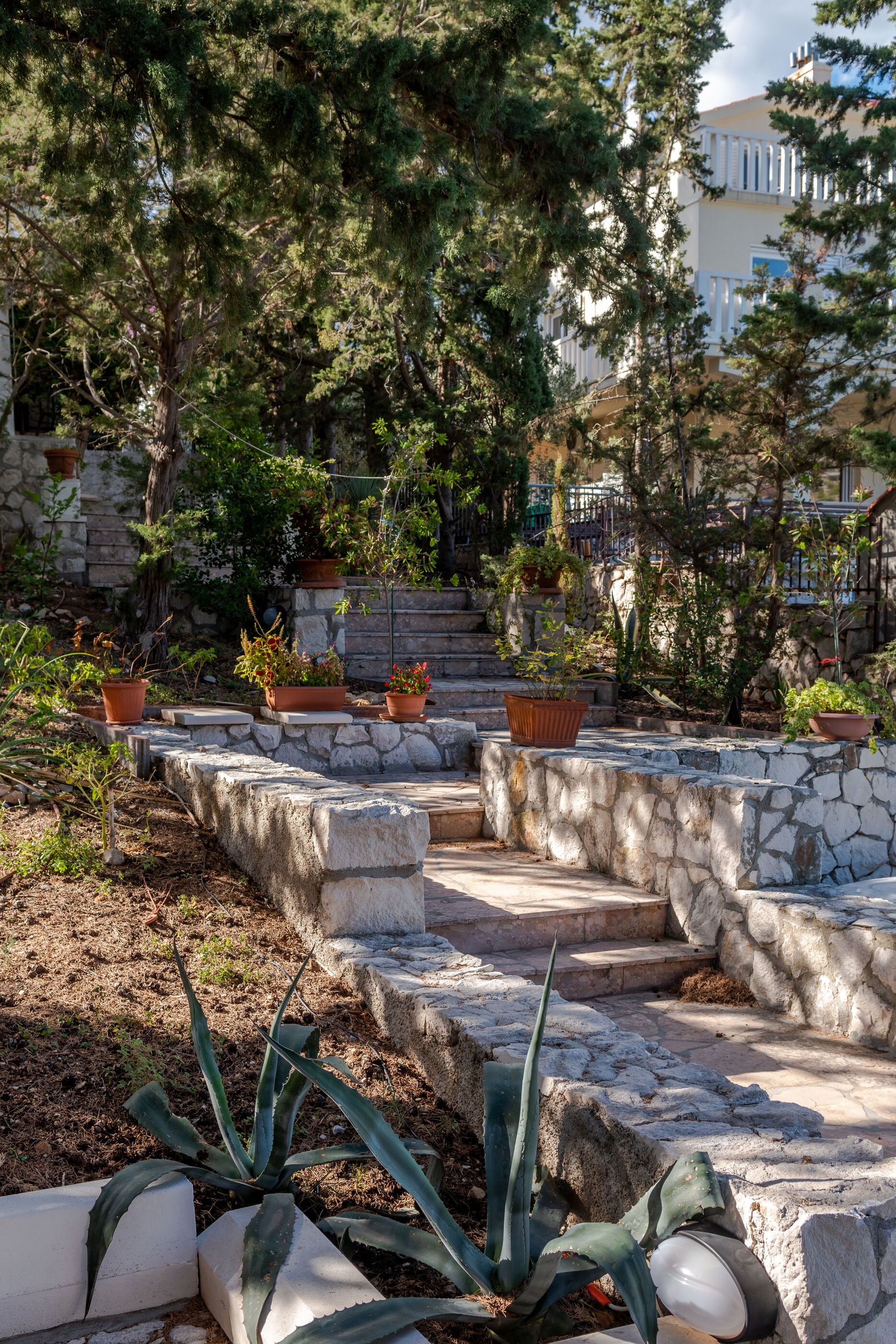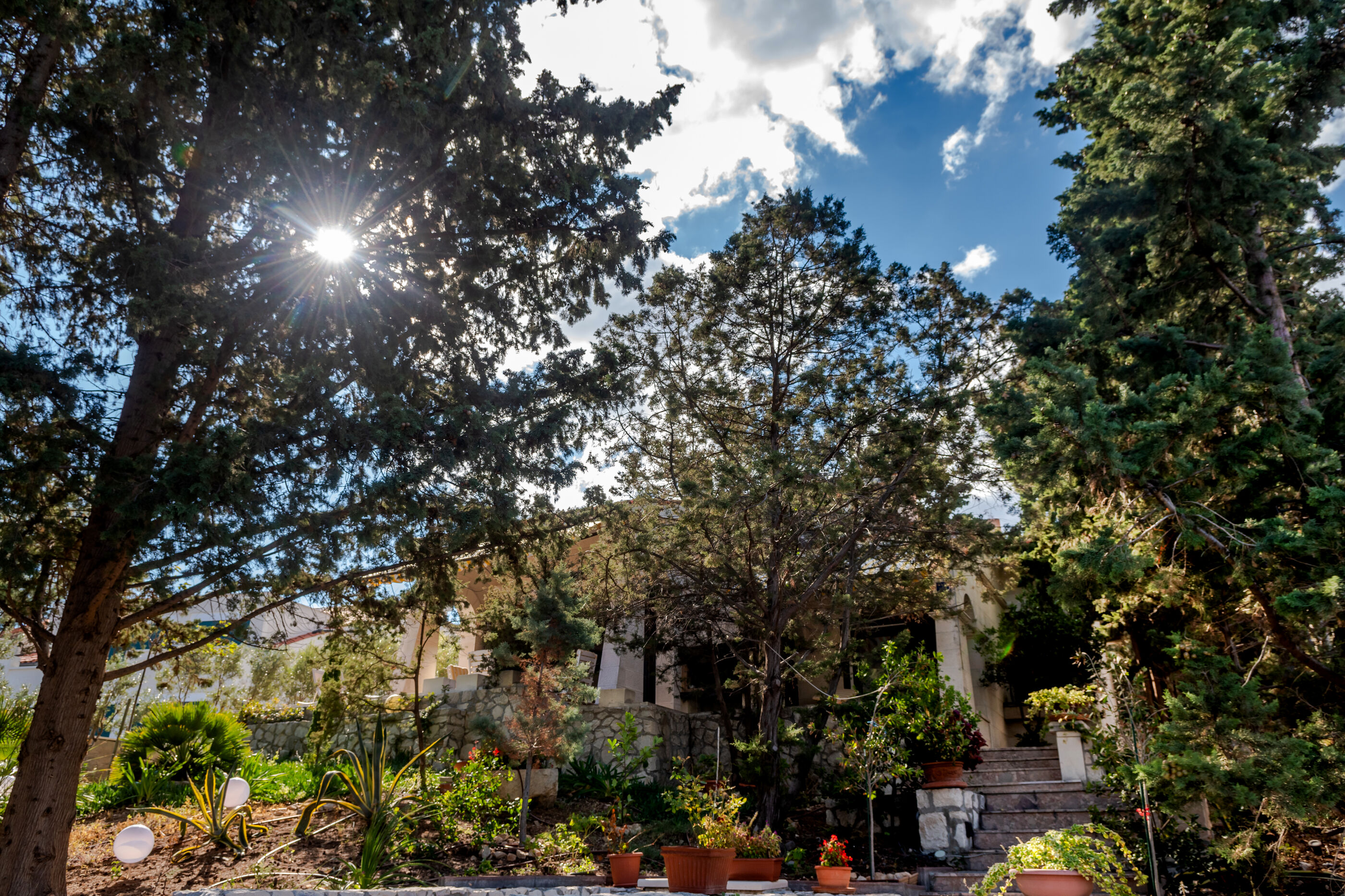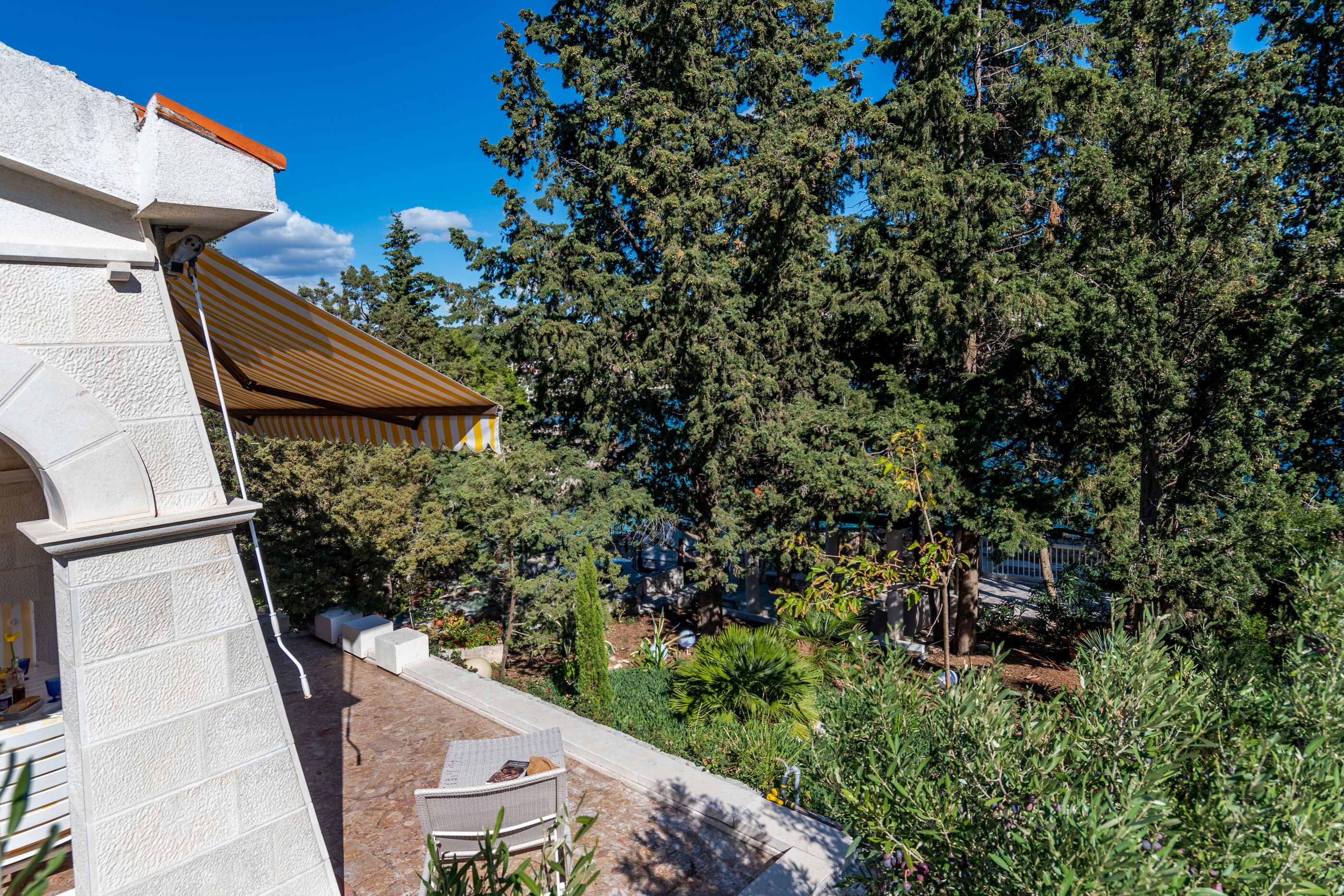 Beautiful house with light and high ceilings & escher-like marble staircase in middle of ground floor.... ......It provided three generations of our family a fantastic base to stay together we particularly enjoyed the "temple" and hammocks in garden and proximity to bay - We worried someone might fall down the stairs (no one did).
