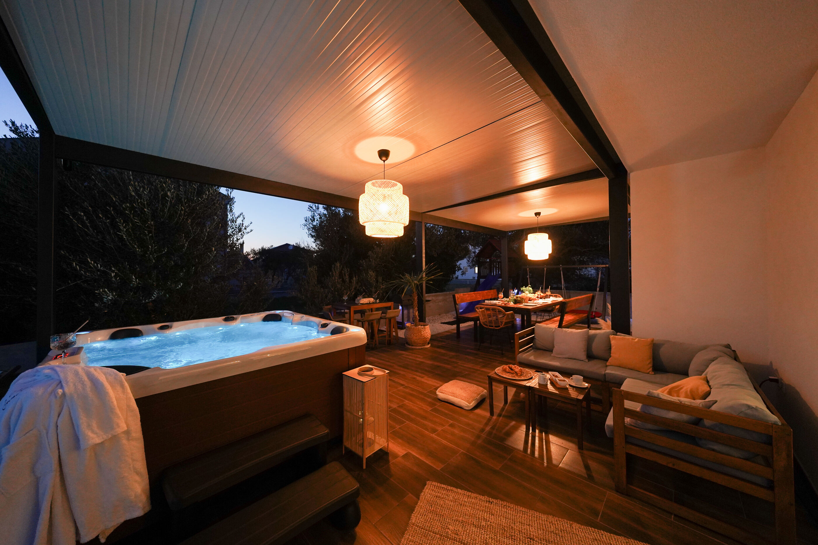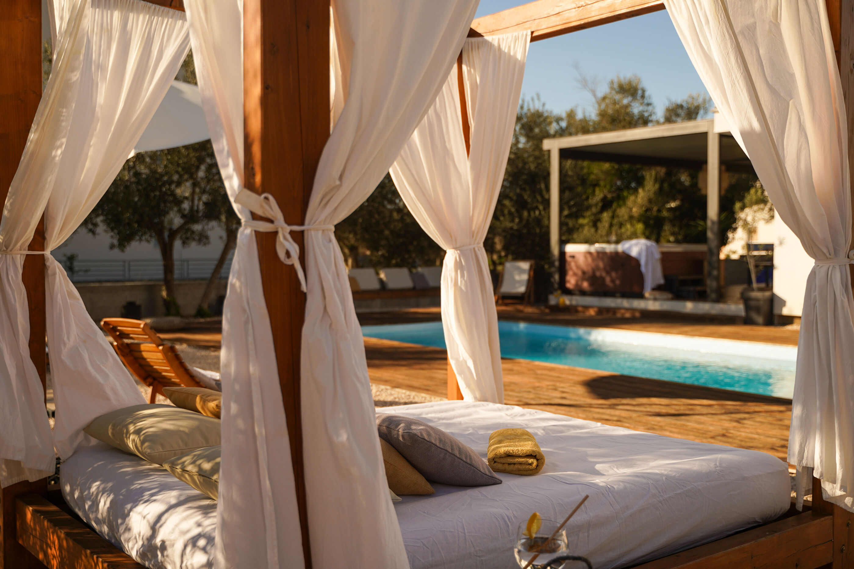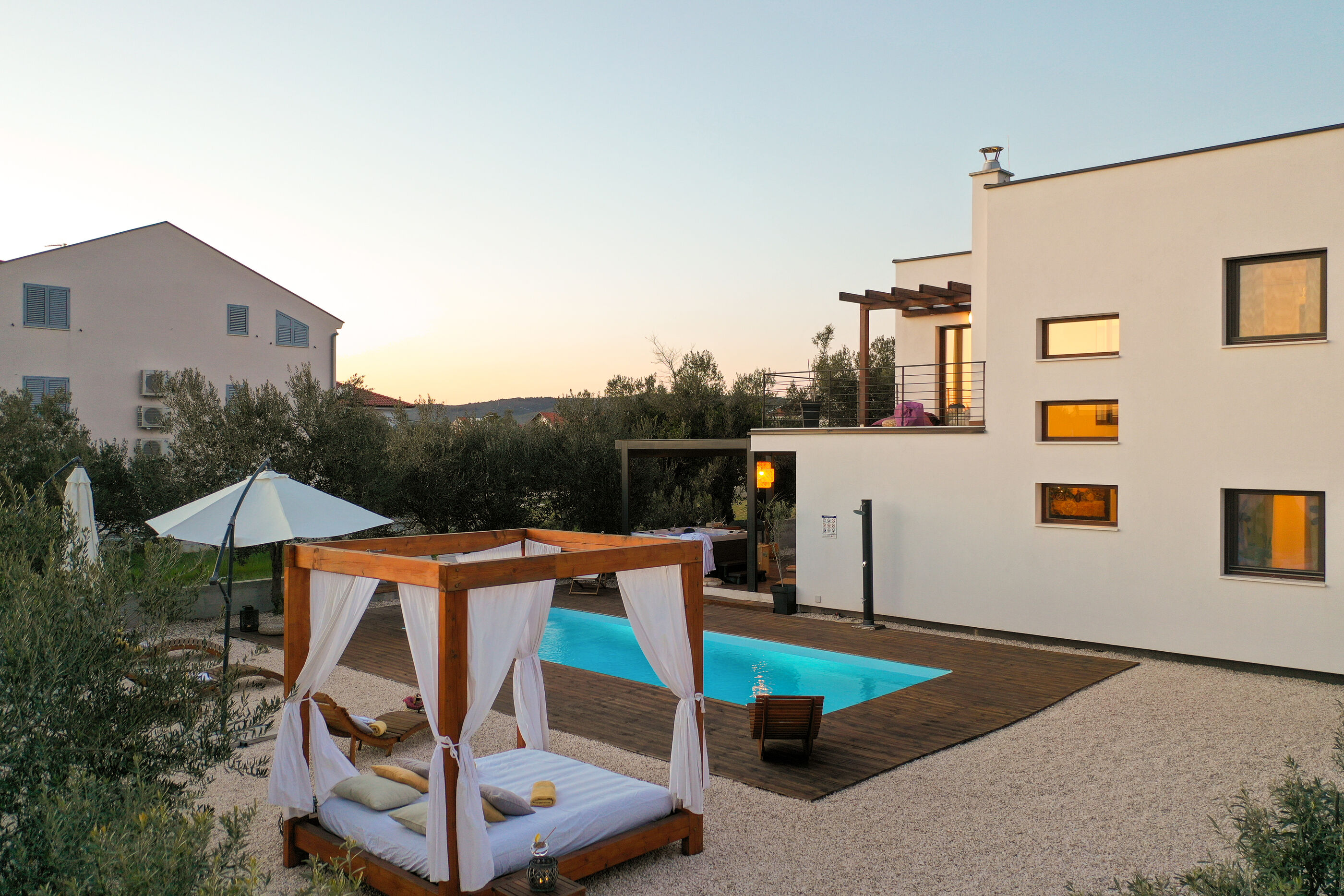 Uživajte u kristalno čistom moru i dugim zalascima na pješčana i betonske ploče plaži, udaljenoj 300 m. Za one koji preferiraju privatnost, uronite u Vanjski bazen i upijajte sunce cijeli dan.