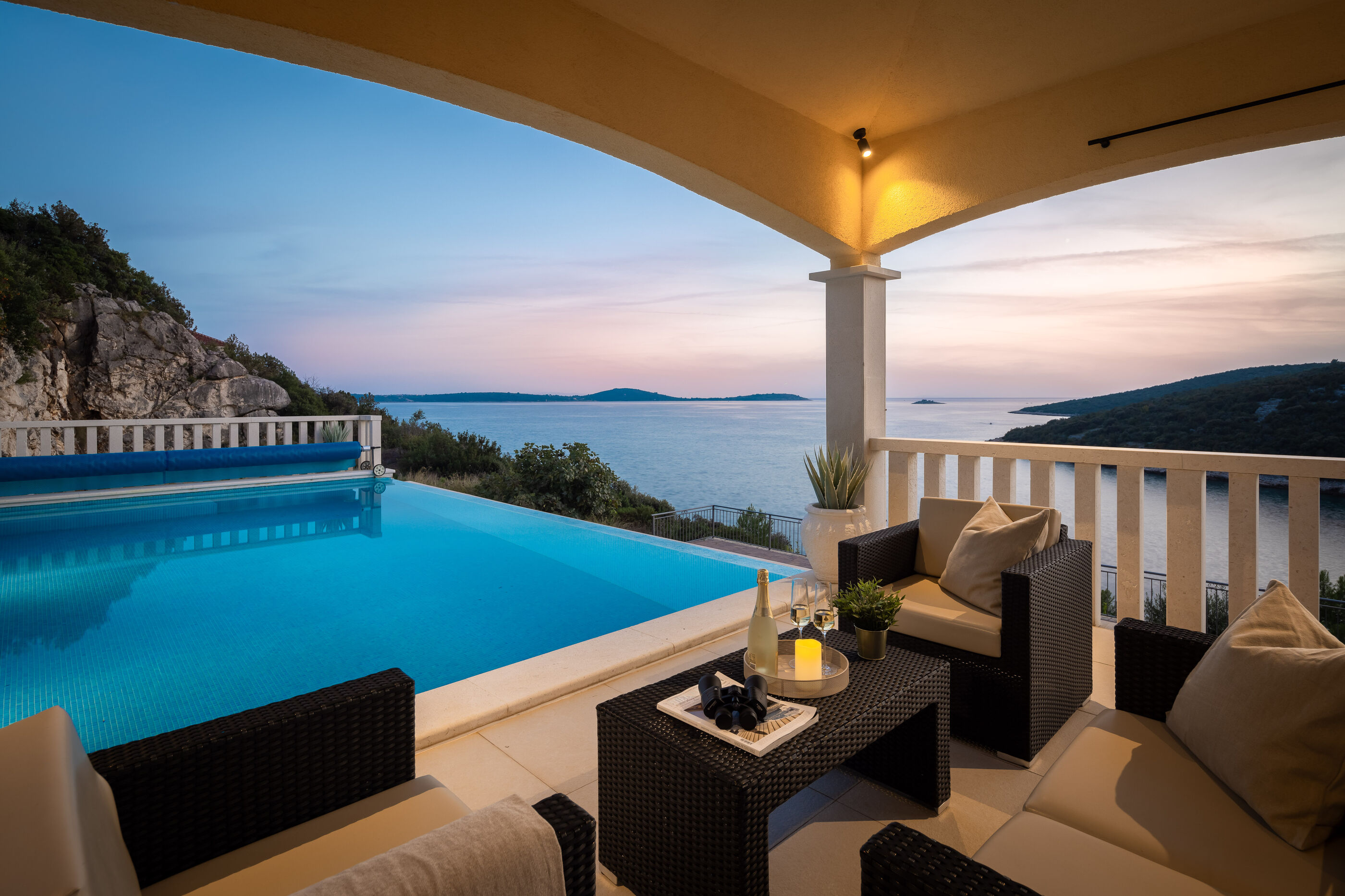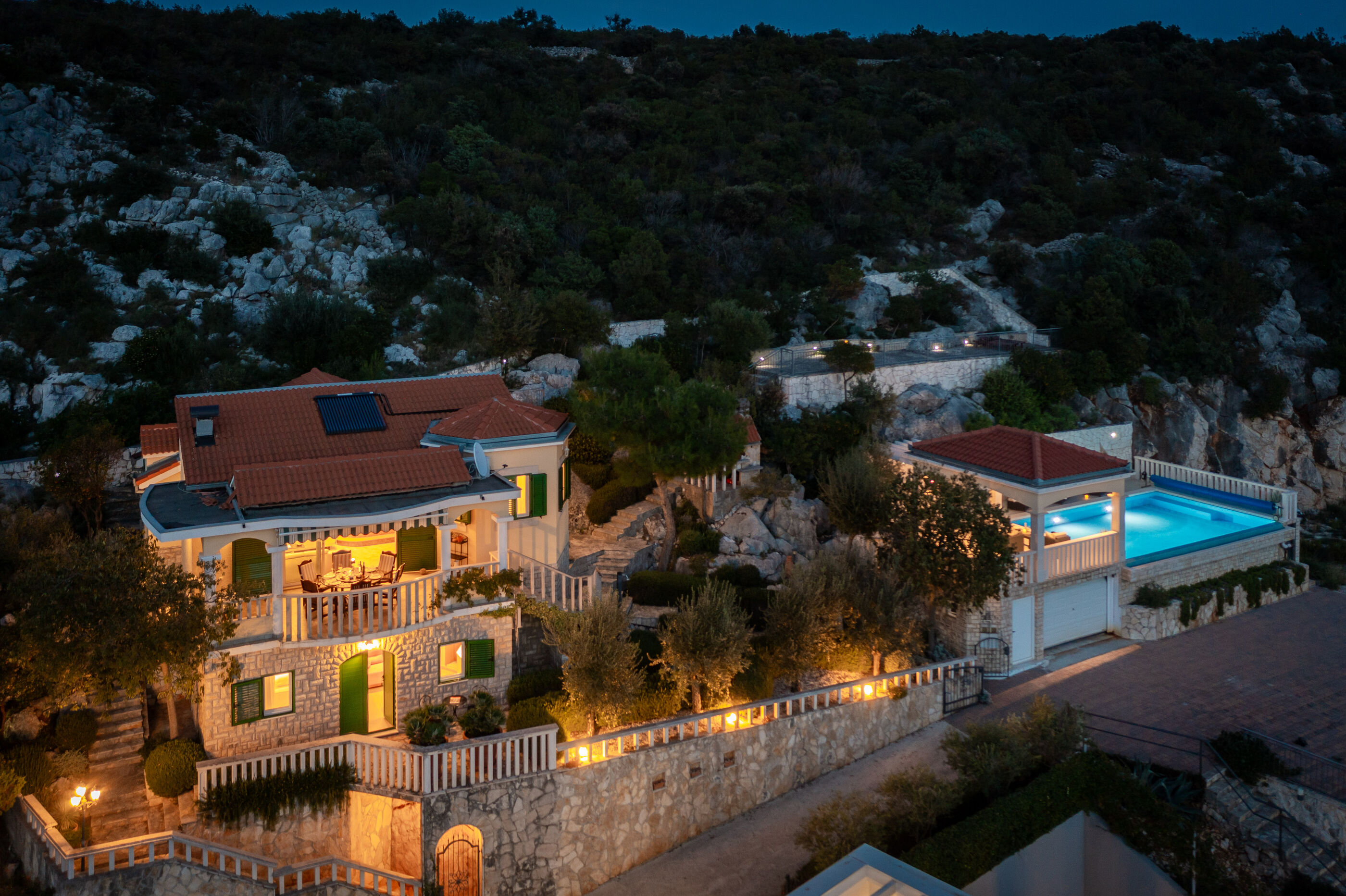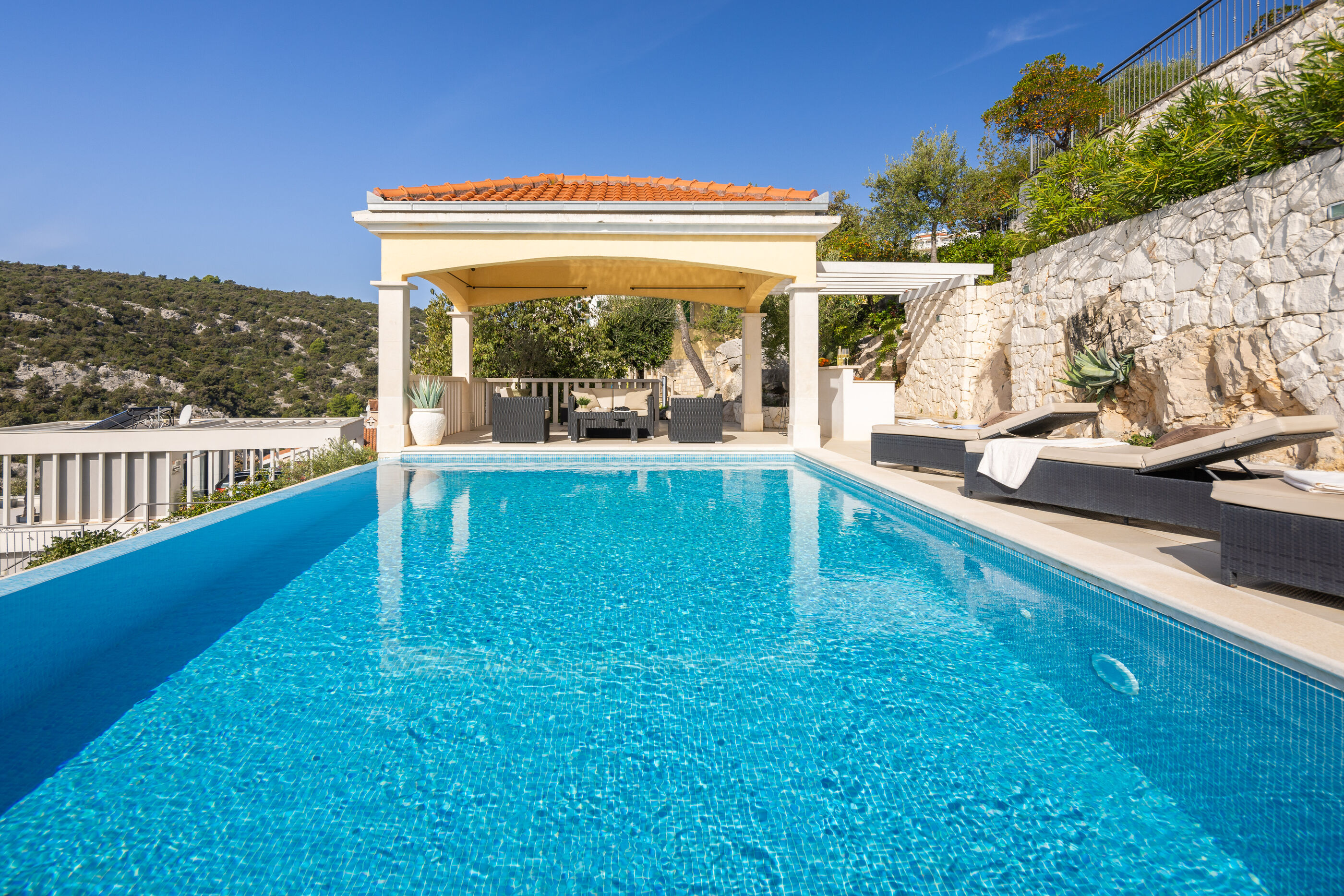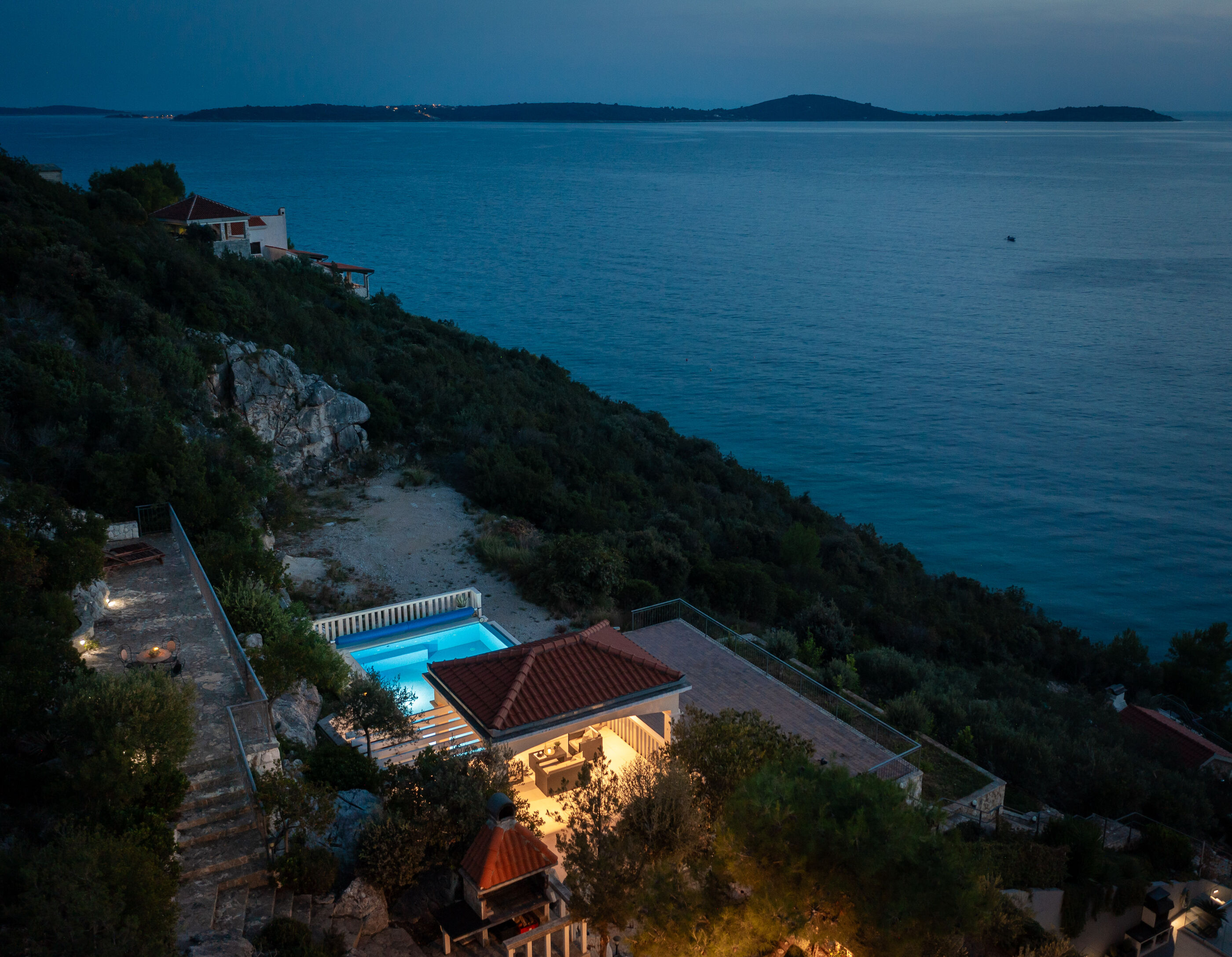 Privatni vanjski bazen i terasa za sunčanje savršeno su mjesto za opuštanje dok uživate u panoramskom pogledu na kristalno čisto Jadransko more. Gosti se također mogu opustiti u natkrivenoj vanjskoj blagovaonici s roštiljem, idealnoj za uživanje u ukusnim jelima s pogledom.