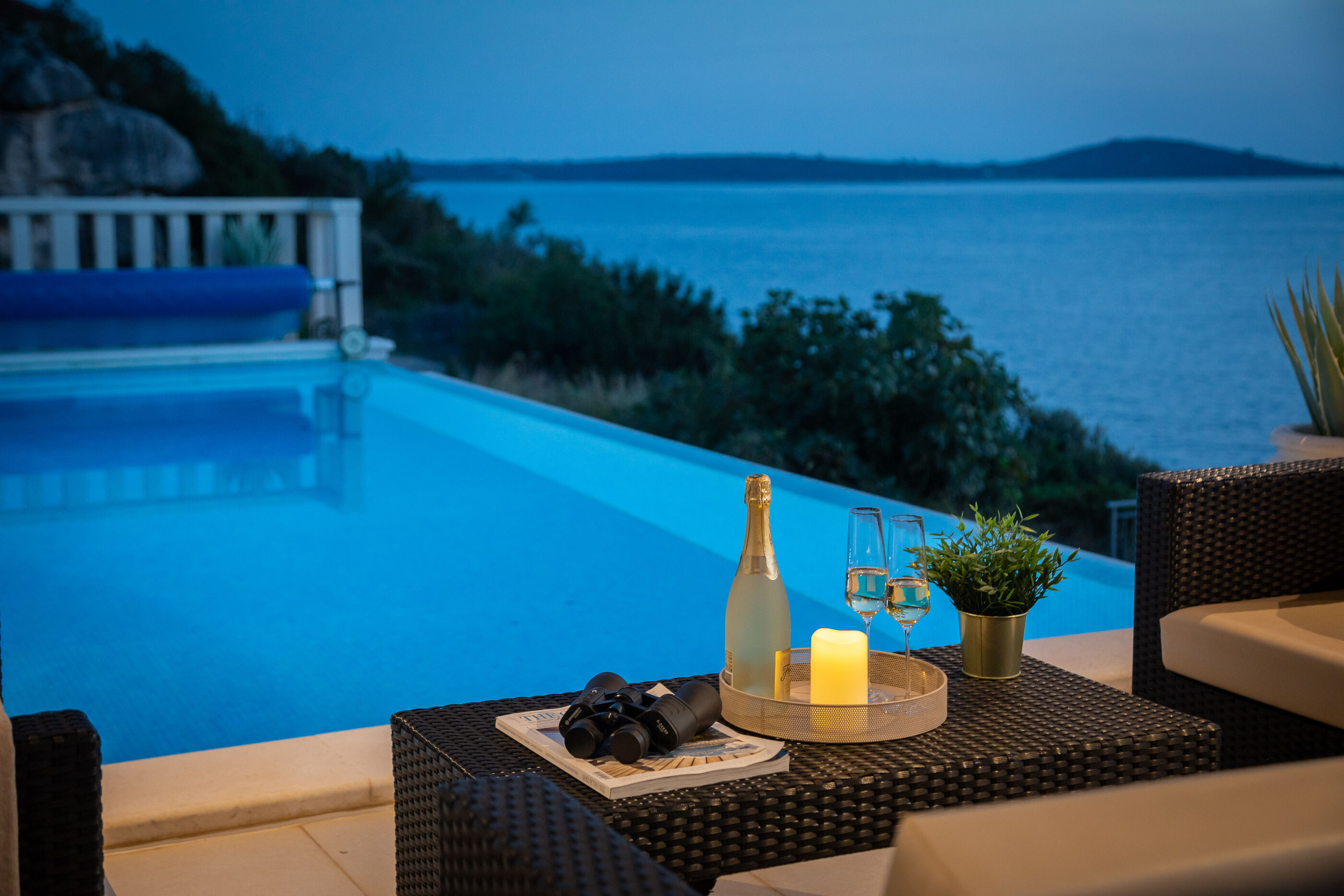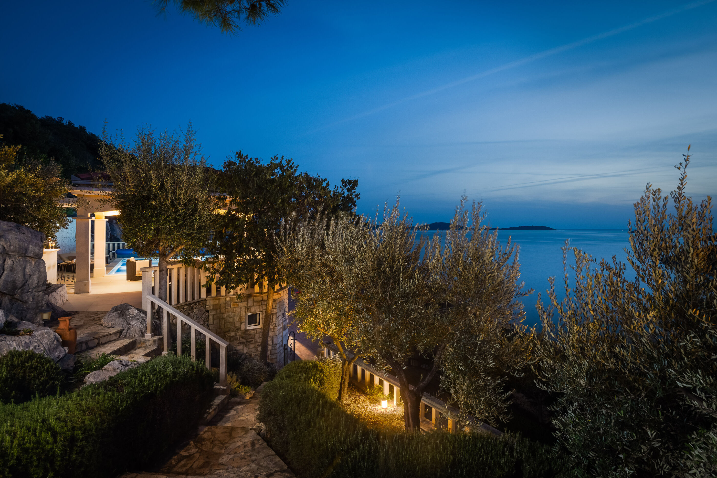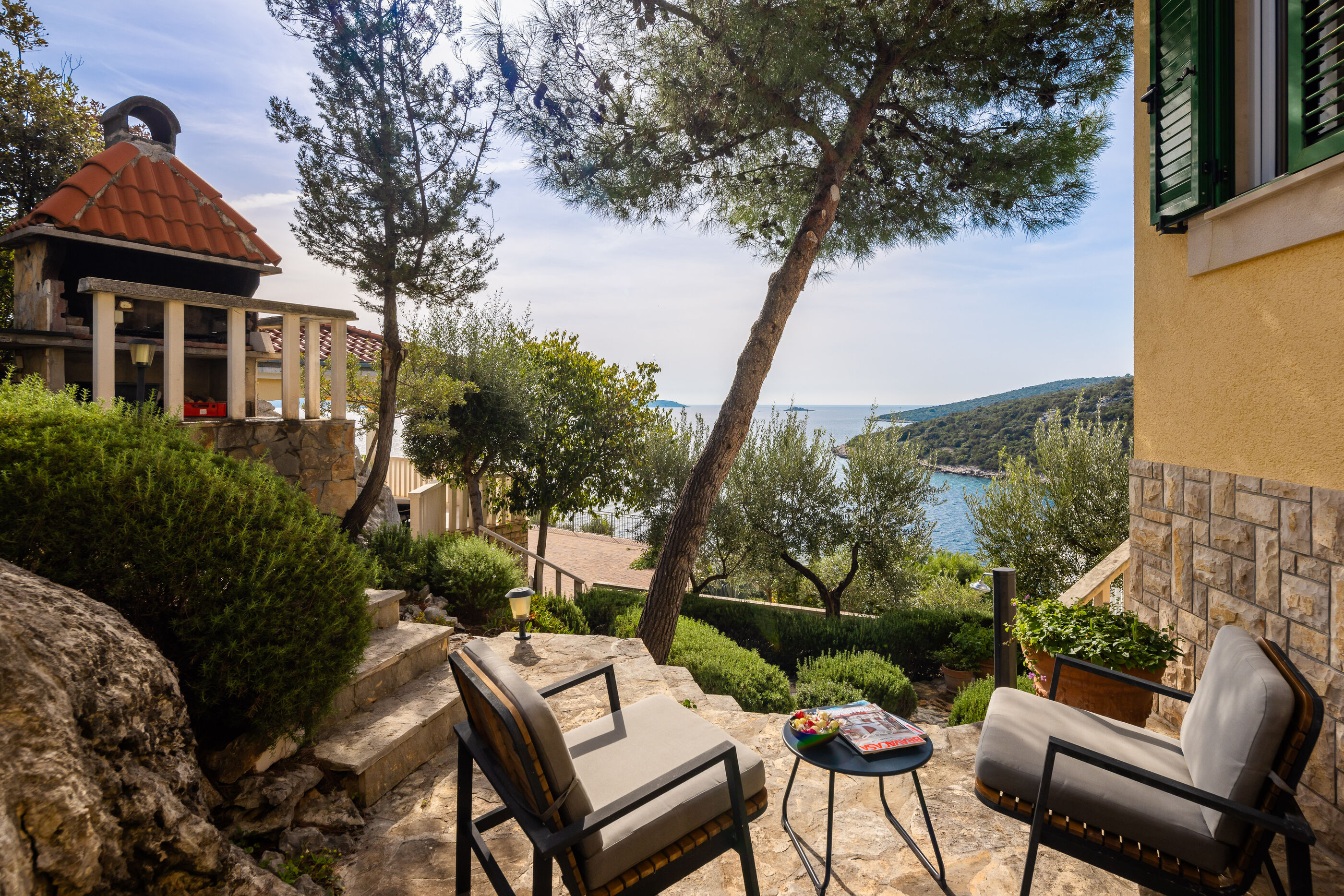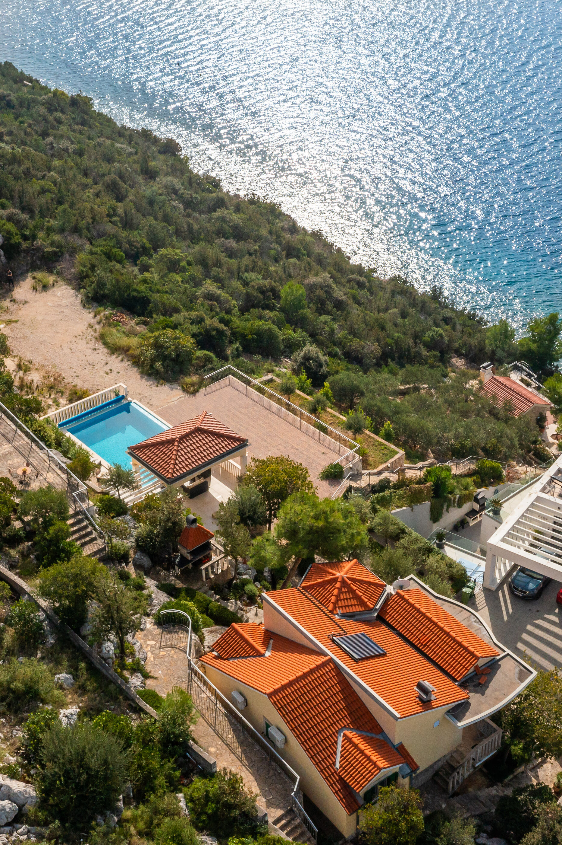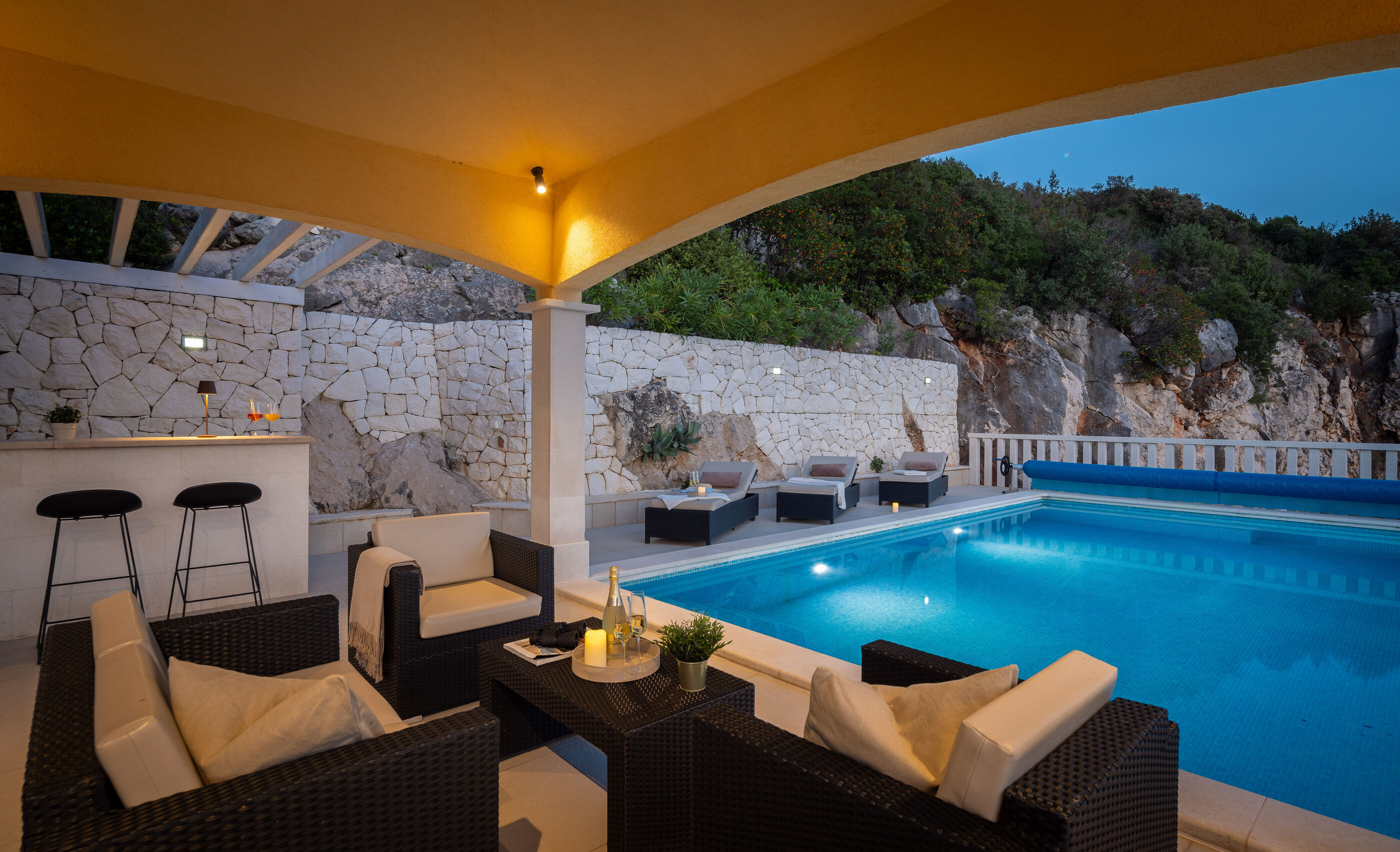 Privatni vanjski bazen i terasa za sunčanje savršeno su mjesto za opuštanje dok uživate u panoramskom pogledu na kristalno čisto Jadransko more. Gosti se također mogu opustiti u natkrivenoj vanjskoj blagovaonici s roštiljem, idealnoj za uživanje u ukusnim jelima s pogledom.