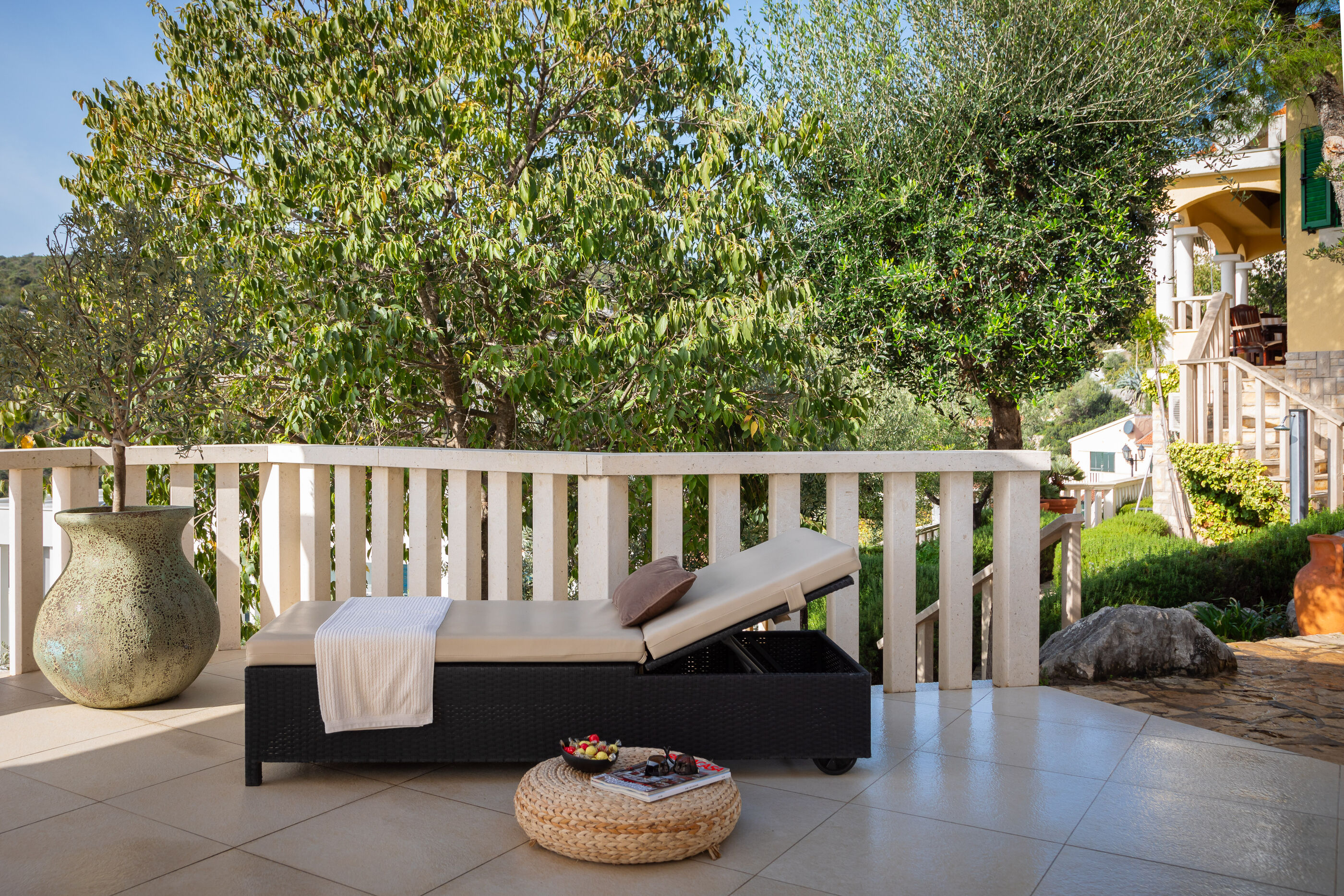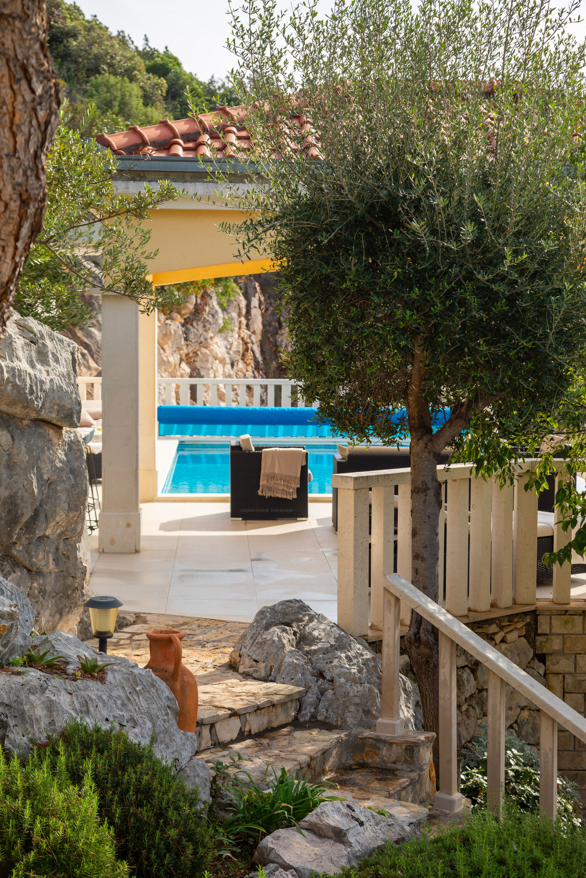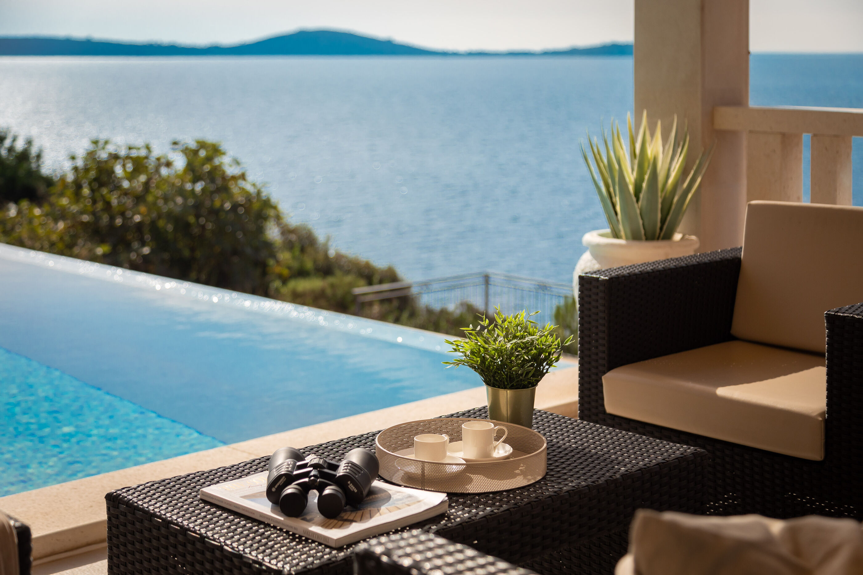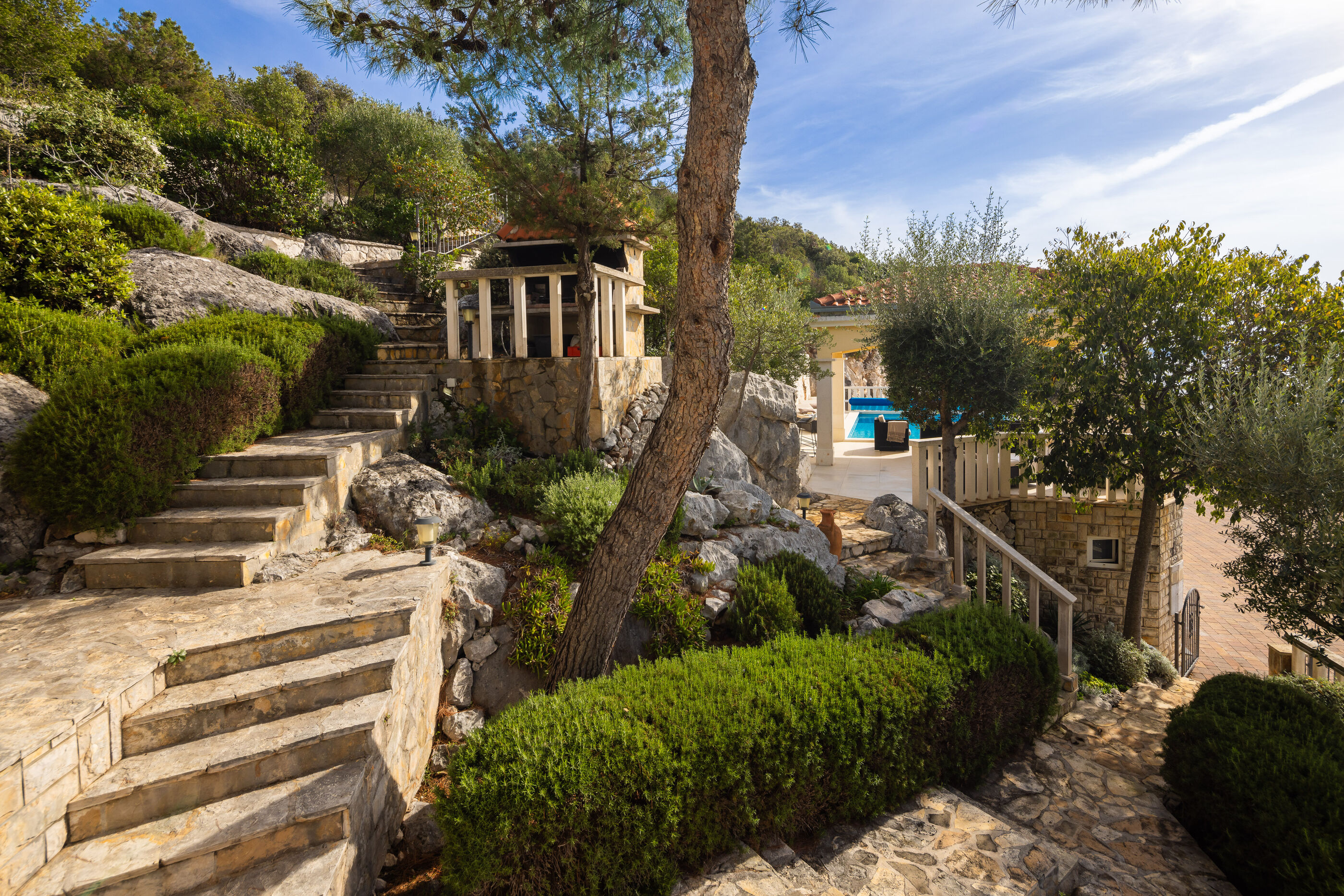 Privatni vanjski bazen i terasa za sunčanje savršeno su mjesto za opuštanje dok uživate u panoramskom pogledu na kristalno čisto Jadransko more. Gosti se također mogu opustiti u natkrivenoj vanjskoj blagovaonici s roštiljem, idealnoj za uživanje u ukusnim jelima s pogledom.